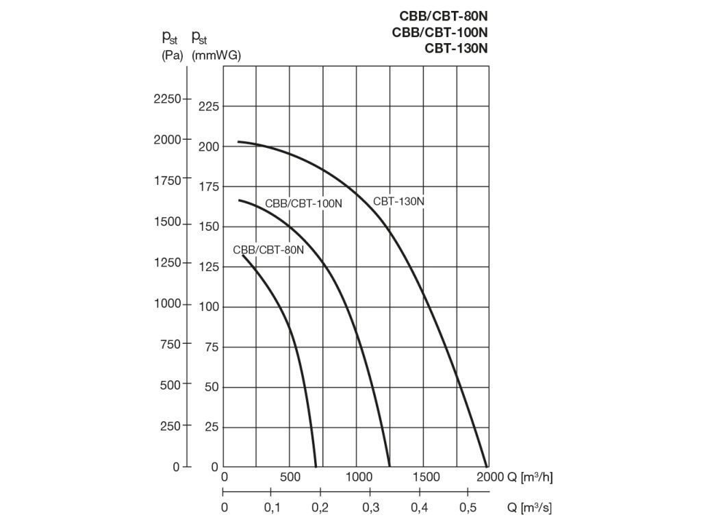 Radiální ventilátor CBB-80N je vhodný svojí konstrukcí pro velmi dlouhé vzduchovody v různých technologických a VZT aplikacích. Spirální skříň radiálního ventilátoru CBB-80N je odlita ze slitiny hliníku a je opatřena šedým epoxydovým lakem. Teplota dopravované vzdušniny je 120 °C trvalého provozu. Montáž ventilátoru CBB-80N se provádí na montážní základnu. Motor radiálního ventilátoru je asynchronní s kotvou nakrátko, který je mimo proud vzdušniny. Krytí IP55, třída izolace F.