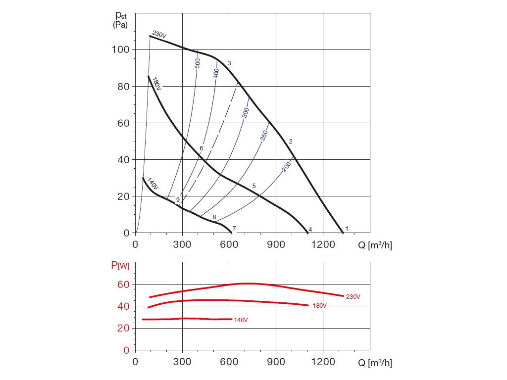 Hluk emitovaný ventilátorem je uveden v tabulkách. Hodnoty LpA na výkonových charakteristikách jsou měřeny ve volném poli na straně sání ve vzdálenosti 1,5 m.