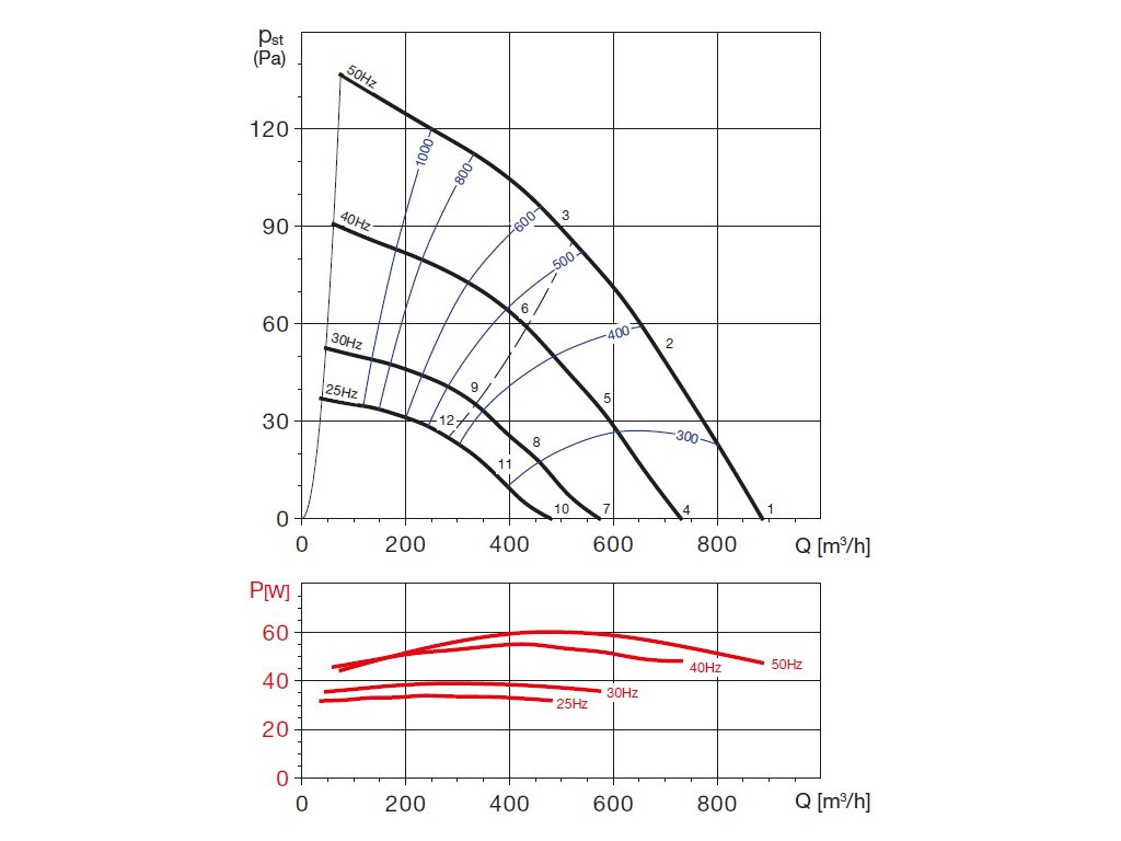Hluk emitovaný ventilátorem je uveden v tabulkách. Hodnoty LpA na výkonových charakteristikách jsou měřeny ve volném poli na straně sání ve vzdálenosti 1,5 m.