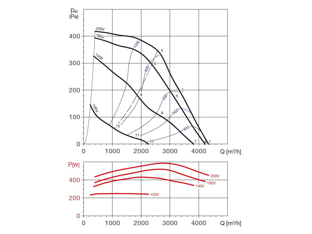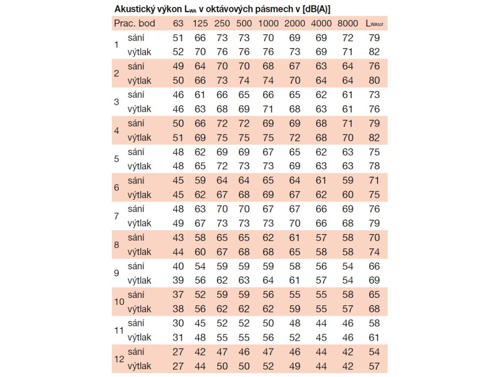 Hluk emitovaný ventilátorem je uveden v tabulkách. Hodnoty LpA na výkonových charakteristikách jsou měřeny ve volném poli na straně sání ve vzdálenosti 1,5 m.
