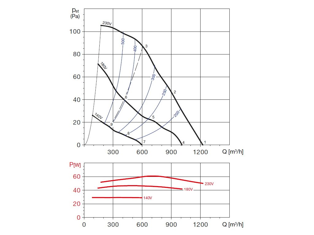 Hluk emitovaný ventilátorem je uveden v tabulkách. Hodnoty LpA na výkonových charakteristikách jsou měřeny ve volném poli na straně sání ve vzdálenosti 1,5 m.