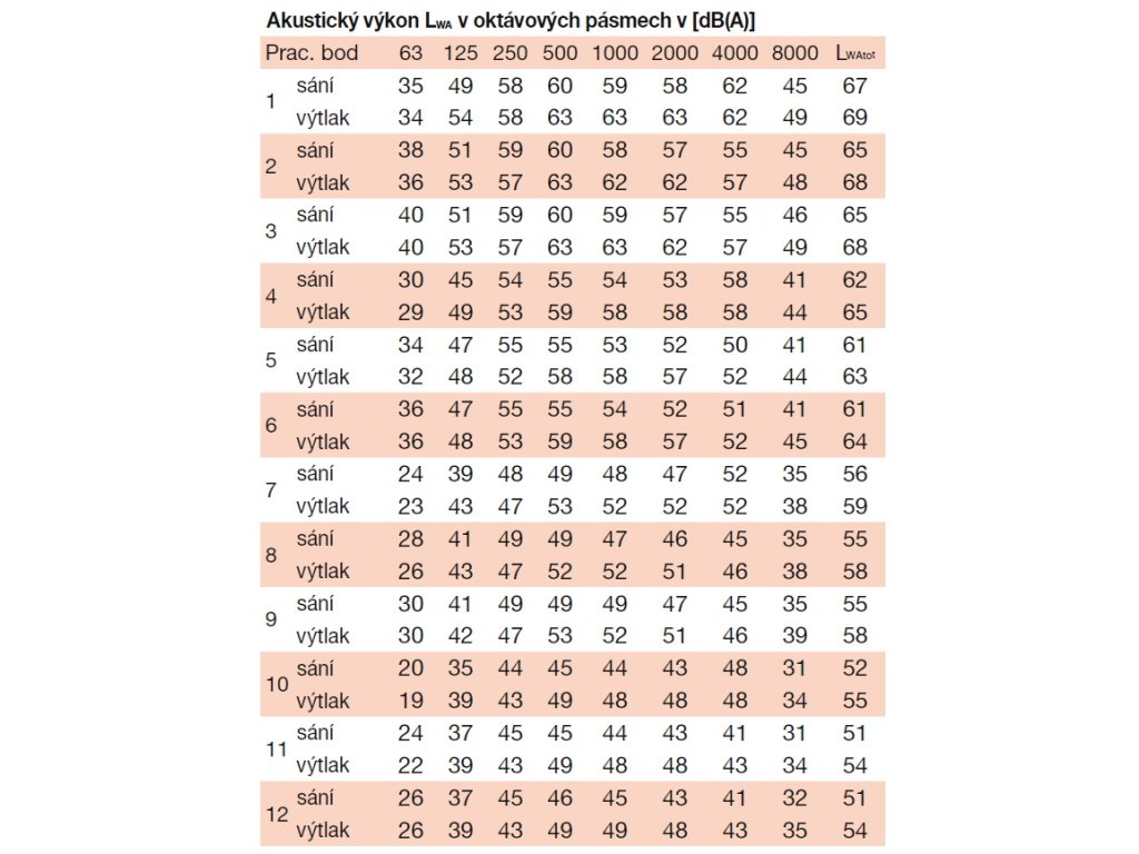 Hluk emitovaný ventilátorem je uveden v tabulkách. Hodnoty LpA na výkonových charakteristikách jsou měřeny ve volném poli na straně sání ve vzdálenosti 1,5 m.