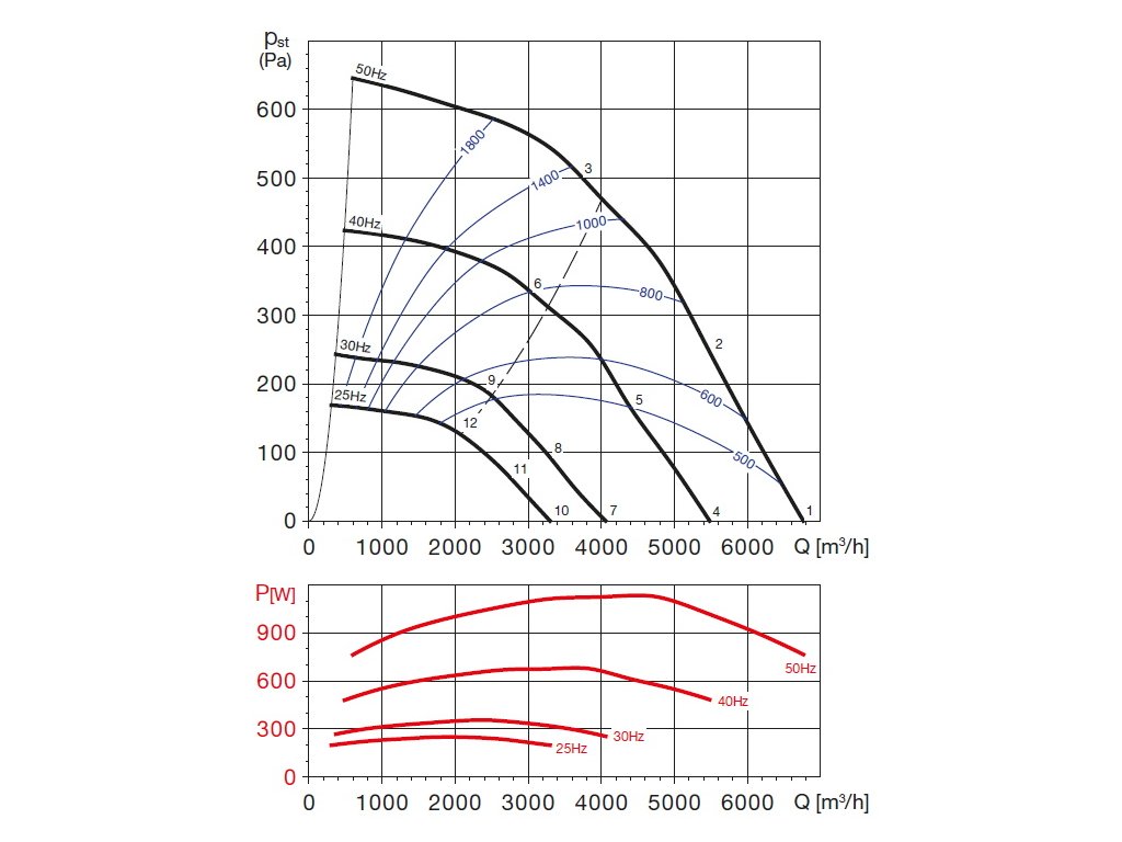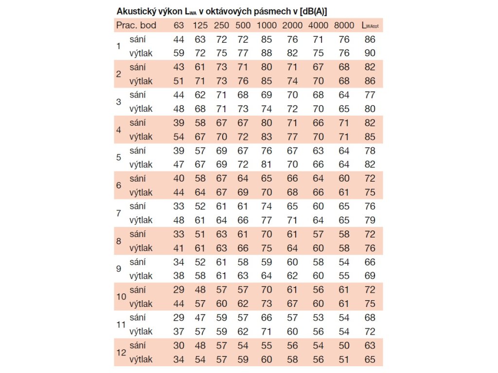 Hluk emitovaný ventilátorem je uveden v tabulkách. Hodnoty LpA na výkonových charakteristikách jsou měřeny ve volném poli na straně sání ve vzdálenosti 1,5 m.