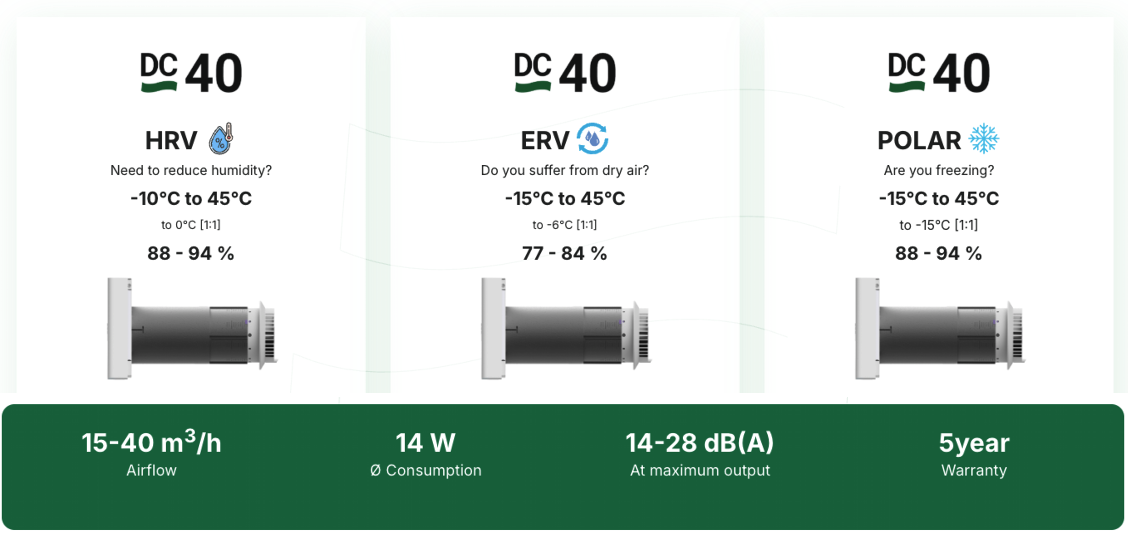 RECUAIR DC40 ERV - a solution for extremely dry indoor air, it can restore humidity to optimal levels, operates at temperatures from -15 °C to 45 °C, suitable for bedrooms and offices