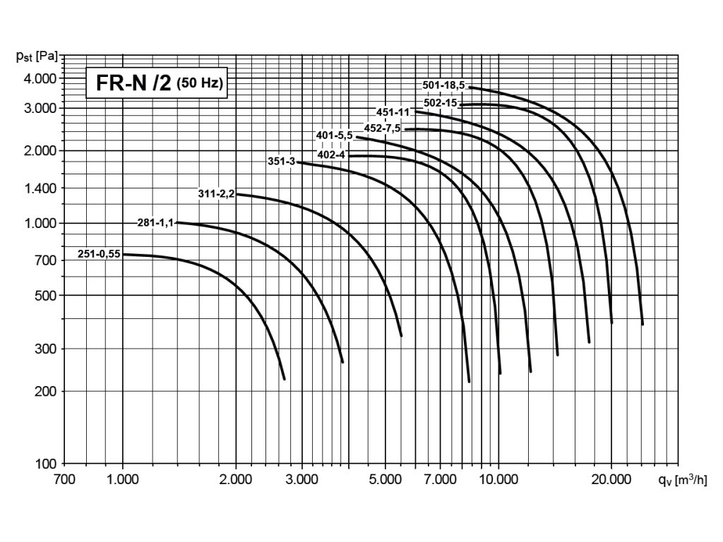 Jednostranně sací radiální průmyslový ventilátor FR 502/2 N 15 kW je vybaven motorem napřímo. Průmyslový radiální ventilátor FR 502/2 N 15 kW je vyroben z ocelového plechu chráněného kataforezním základním nátěrem a polyuretanovým lakem. Radiální ventilátor FR 502/2 N 15 kW s motorem napřímo je navržen pro trvalý provoz, teplota přepravovaného vzduchu je od -20 °C do +60 °C. Na poptávku je možné dodat ventilátor ve speciálním provedení - až do 150 °C nebo také v nevýbušném ATEX provedení.