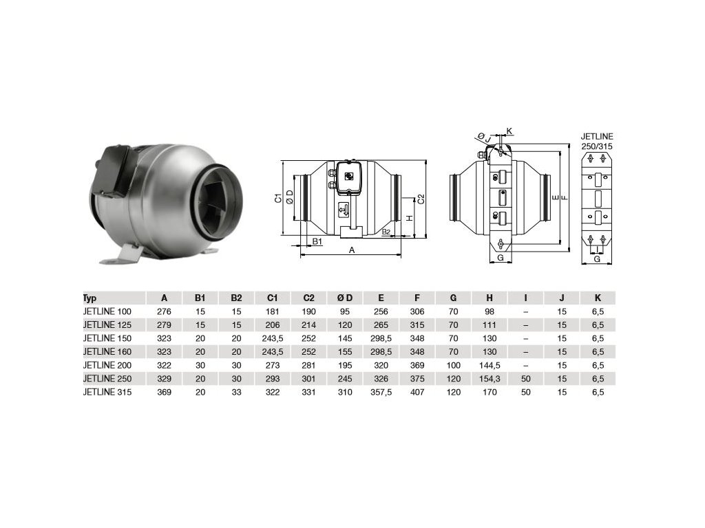 Diagonální potrubní ventilátor JETLINE 100 je určen pro odvětrávání rodinných domů, sociálních zařízení, kanceláří a provozoven. Skříň je vylisována z ocelového pozinkovaného plechu. Kompaktní nízkoprofilový design. Motor ventilátoru je jednofázový asynchronní s vnějším motorem a tepelnou ochranou. Montáž ventilátoru se provádí pomocí montážní konzole (součást dodávky) v každé poloze osy motoru. Skříň nesmí přenášet mechanické namáhání z potrubních rozvodů. Je nutné použít pružné připojení k potrubí. Regulace otáček se provádí elektronickými nebo transformátorovými regulátory.