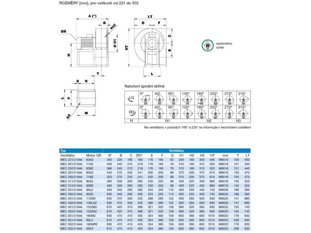 Průmyslový radiální ventilátor MEC 501/2 N 15 kW je vhodný zejména pro středně prašné průmyslové prostředí jako jsou čističky obilí, posklizňové linky, obilná sila či pneumatickou dopravu. Jednostranně sací radiální průmyslový ventilátor MEC 501/2 N 15 kW je vybaven motorem napřímo. Průmyslový radiální ventilátor MEC 501/2 N 15 kW je vyroben z ocelového plechu chráněného kataforezním základním nátěrem a polyuretanovým lakem. Radiální ventilátor MEC 501/2 N 15 kW s motorem napřímo je navržen pro trvalý provoz, teplota přepravovaného vzduchu je od -20 °C do +60 °C. Na poptávku je možné dodat ventilátor ve speciálním provedení - až do +300 °C nebo také v nevýbušném ATEX provedení.