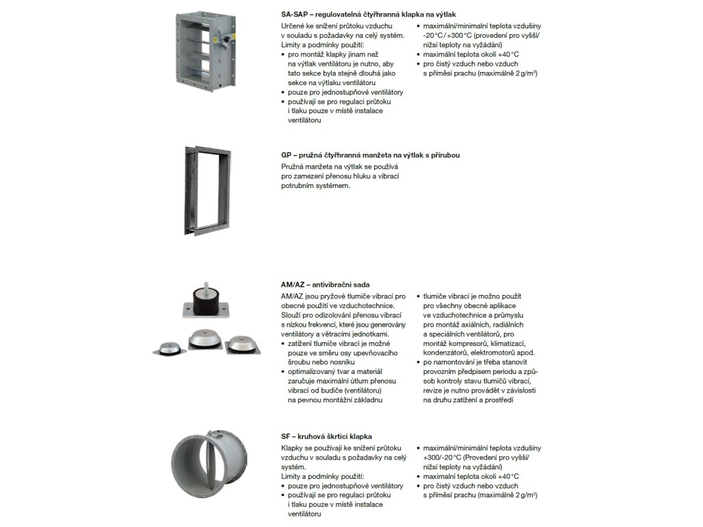 - revizní dvířka, odvod kondenzátu, ucpávka hřídele, antivibrační sada, nátrubek pro odvod kondenzátu, ochranná mřížka na sání, plynotěsné provedení, provedení s vyšší otěruvzdorností, svařovaná spirální skříň, tepelně izolovaná spirální skříň
