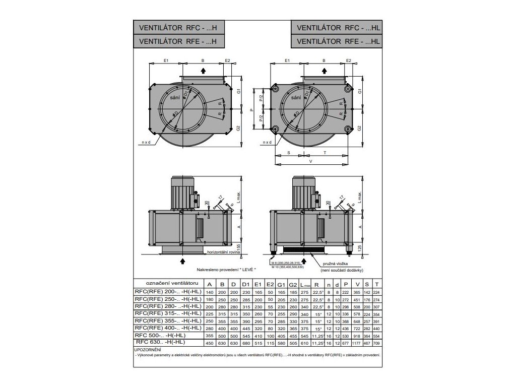 Ventilátor RFC se instaluje pomocí 4 šroubů M8 nebo M10 a 4 pryžových izolátorů chvění. Ventilátor musí být zapojen přes motorový spouštěč nebo proudovou ochranu nastavenou na jmenovitý proud motoru.