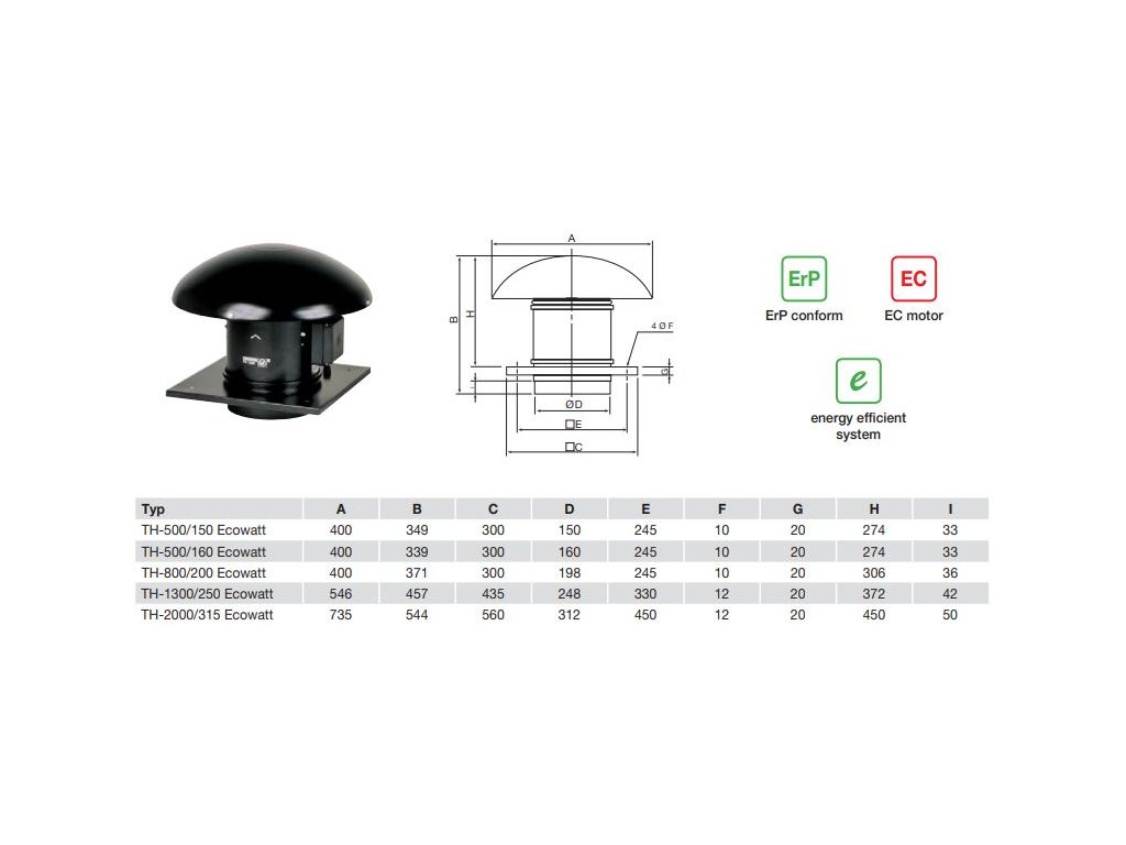 Střešní ventilátor TH 800/200 Ecowatt s úsporným EC motorem je určený pro přívod i odvod vzduchu z rodinných domů, komerčních a průmyslových objektů. Ventilátor na střechu TH 800/200 Ecowatt se standardně dodává jako odvodní, změna použití je pouze otočením ventilátorové jednotky po uvolnění montážních spon a vložením (případně vyjmutím) usměrňovací vložky. Motor ventilátoru TH 800/200 Ecowatt je úsporný EC motor s tepelnou pojistkou proti přetížení. Krytí IP44, pracovní teplota -20 °C až +60 °C.
