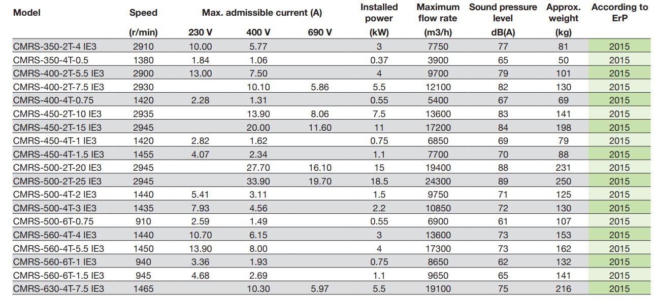 Extrémně robustní radiální ventilátory Sodeca CMRS jsou jednostranně sací středotlaké ventilátory osazené radiální oběžným kolem s dozadu zahnutými lopatkami. Radiální ventilátory Sodeca CMRS mají skříň a oběžné kolo vyrobené z galvanizovaného ocelového plechu. Radiální ventilátory Sodeca CMRS jsou speciálně navrženy pro dopravu čistého nebo mírně prašného vzduchu. Účinnost motorů IE3 pro výkony rovné nebo větší než 0,75 kW kromě jednofázového, 2-rychlostní a 8-pólové. Motory ventilátorů Sodeca CMRS jsou třídy F, krytí IP55. Teplota dopravovaného vzduchu je -25 °C až +120 °C.