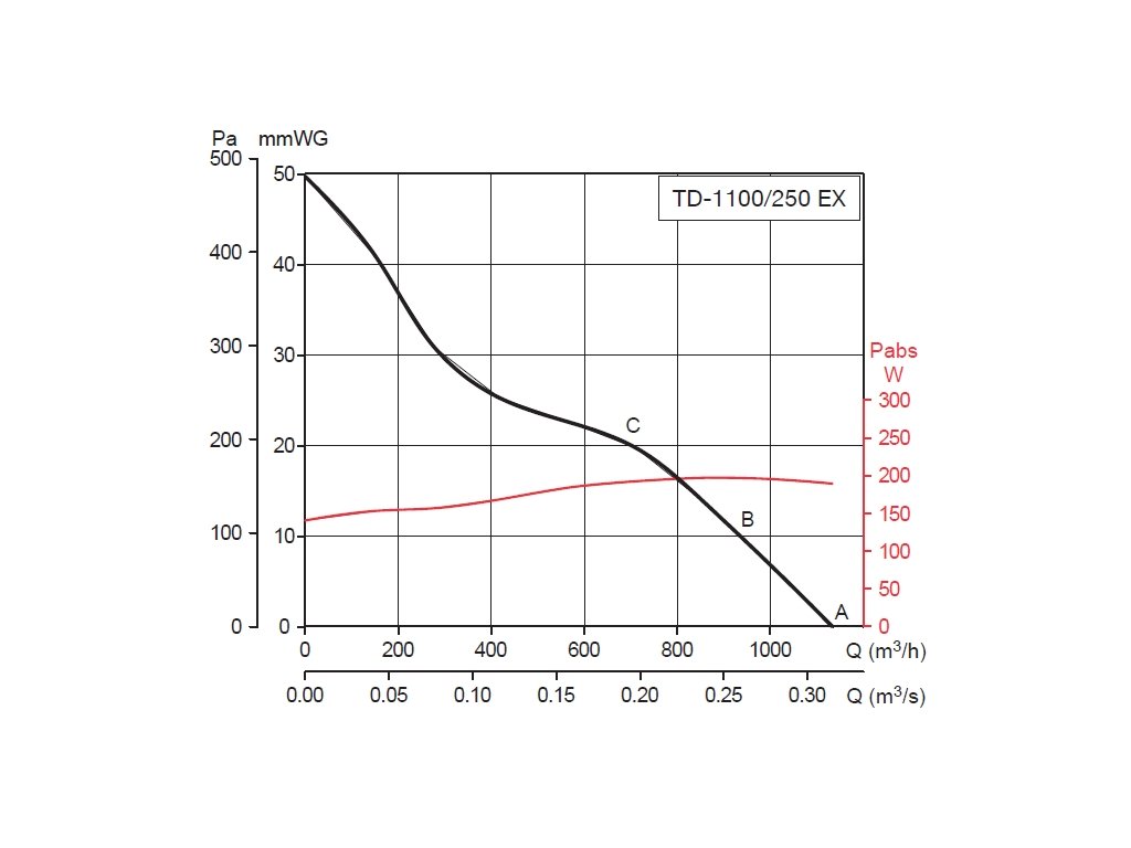 Potrubní nevýbušný ventilátor TD 1100/250 Ex má asynchronní motor s kotvou nakrátko, stator je s chladícími žebry. Skříň ventilátoru do výbušného prostředí je z ocelového plechu opatřeného černým polyesterovým lakem, držáky a šrouby jsou navíc galvanicky pokoveny. Montáž ventilátoru je v každé poloze osy motoru.