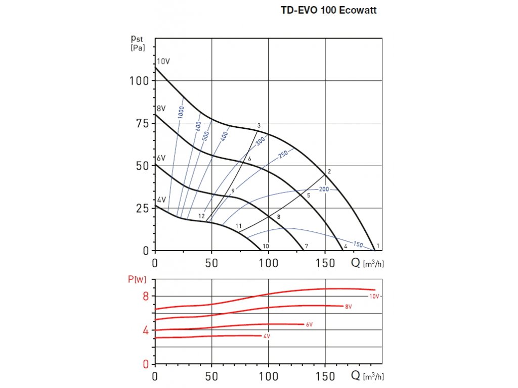 Diagonální potrubní ventilátor TD-EVO 100 má střídavý motor s trojím vinutím, což umožňuje provoz s trojími otáčkami. Skříň ventilátoru je vyrobena z tvrzeného plastu. Skříň se skládá z montážní lišty s dvěma hrdly, opatřenými těsněním a motoru, který je s hrdly spojen rychloupínacími sponami. Oběžné kolo ventilátoru TD-EVO 100 je vyrobeno z plastu.