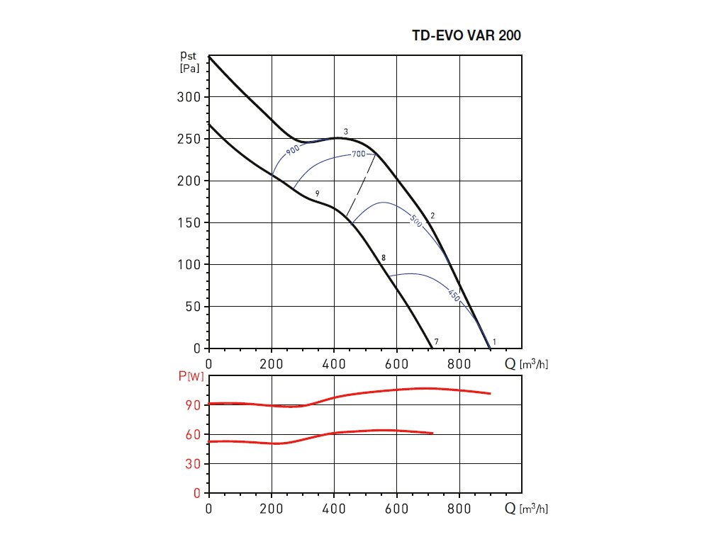 Diagonální potrubní ventilátor TD-EVO 200 VAR s časovým nastavitelným doběhem (1 až 30 minut) má integrovaný triakový regulátor umožňující plynulou změnu výkonu dle nastavení potenciometru ve svorkovnici ventilátoru nebo analogovým vstupem 0-10 V. Skříň ventilátoru je vyrobena z tvrzeného plastu. Skříň se skládá z montážní lišty s dvěma hrdly, opatřenými těsněním a motoru, který je s hrdly spojen rychloupínacími sponami. Oběžné kolo ventilátoru TD-EVO 200 VAR je vyrobeno z plastu.