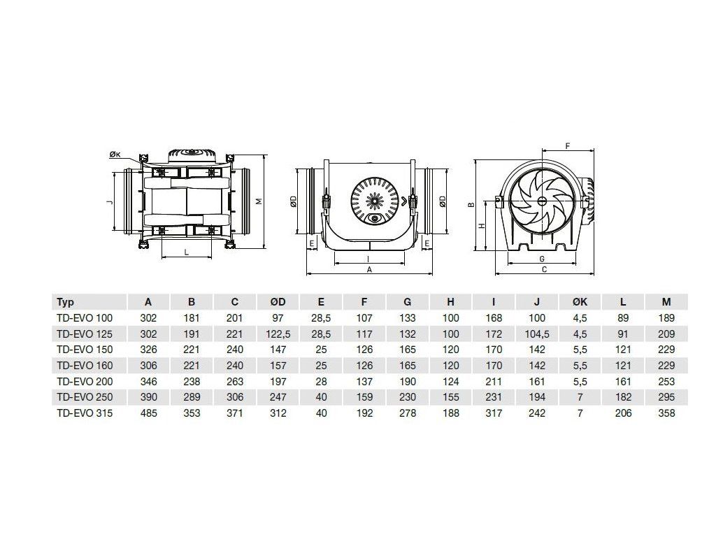 Diagonální potrubní ventilátor TD-EVO 200 má střídavý motor s trojím vinutím, což umožňuje provoz s trojími otáčkami. Skříň ventilátoru je vyrobena z tvrzeného plastu. Skříň se skládá z montážní lišty s dvěma hrdly, opatřenými těsněním a motoru, který je s hrdly spojen rychloupínacími sponami. Oběžné kolo ventilátoru TD-EVO 200 je vyrobeno z plastu.