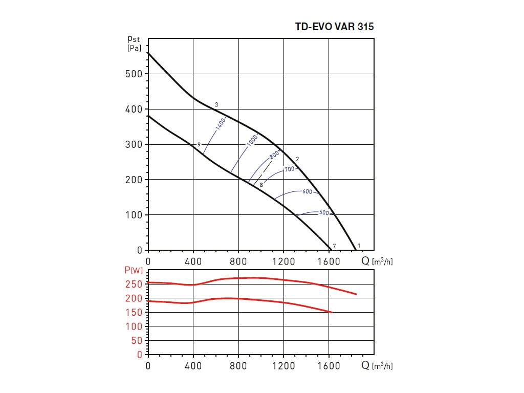 Diagonální potrubní ventilátor TD-EVO 315 VAR s časovým nastavitelným doběhem (1 až 30 minut) má integrovaný triakový regulátor umožňující plynulou změnu výkonu dle nastavení potenciometru ve svorkovnici ventilátoru nebo analogovým vstupem 0-10 V. Skříň ventilátoru je vyrobena z tvrzeného plastu. Skříň se skládá z montážní lišty s dvěma hrdly, opatřenými těsněním a motoru, který je s hrdly spojen rychloupínacími sponami. Oběžné kolo ventilátoru TD-EVO 315 VAR je vyrobeno z plastu.