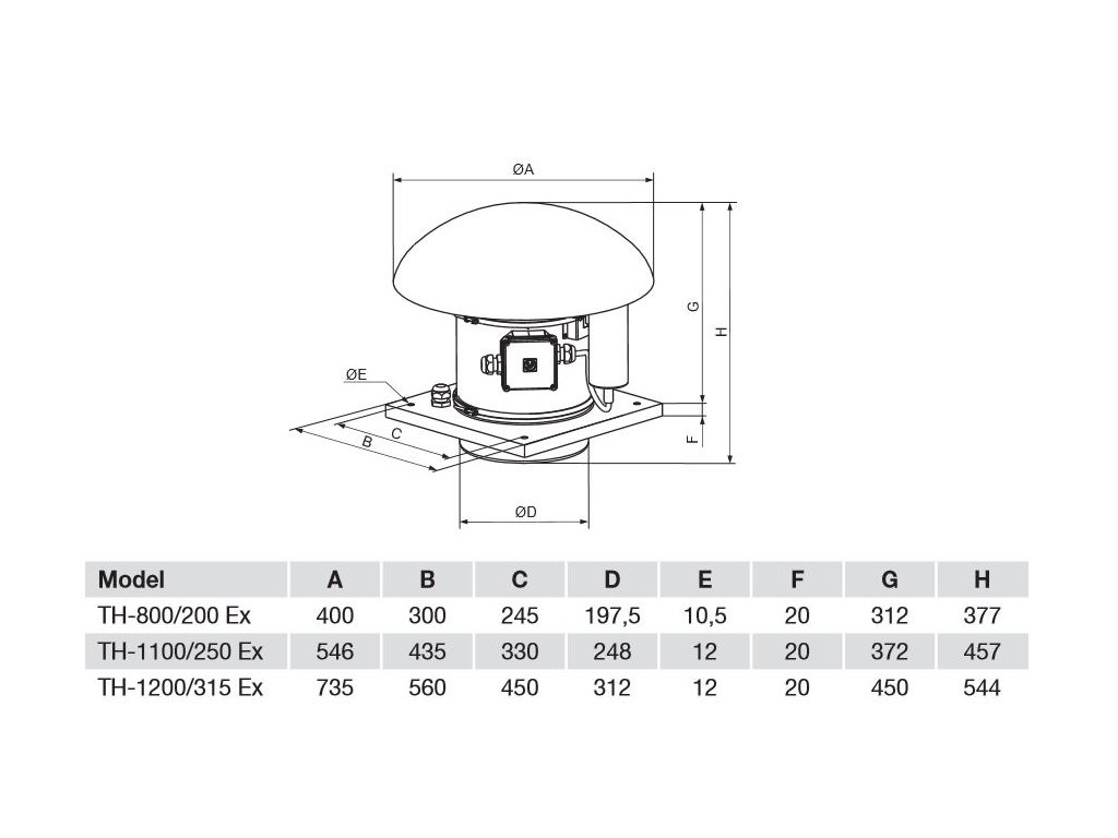 Střešní nevýbušný ventilátor TH 1200/315 Ex má asynchronní motor s kotvou nakrátko, stator je s chladícími žebry. Skříň ventilátoru do výbušného prostředí je z antistatického plastu / ocelového plechu opatřeného černým polyesterovým lakem, držáky a šrouby jsou navíc galvanicky. Střešní ventilátory se montují montážní základnou na vodorovné střešní konstrukce nebo stavebně připravené zděné sokly.